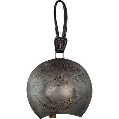 This handsome bell is designed with a Tree of Life symbol. The handle is made of sewn leather and the wooden clapper produces a rhythmic organic sound.
