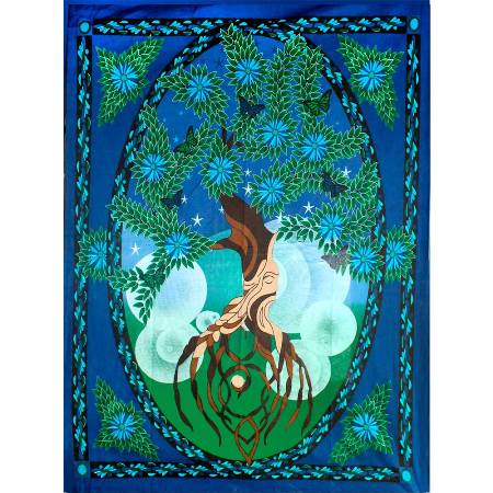 This lovely tapestry features the majestic image of the Tree of Life. Within its branches are delicate blue flowers and butterflies. An elegant black and blue border perfectly frame the image. Each beautiful tapestry is meticulously hand crafted from 100% cotton. Tapestries can be hung on the wall, used as tablecloth, blanket, curtain, or as a focal point for meditation. Symbol The tree of Life is the structure on which the universe is built. It explains the immutable laws of Nature.